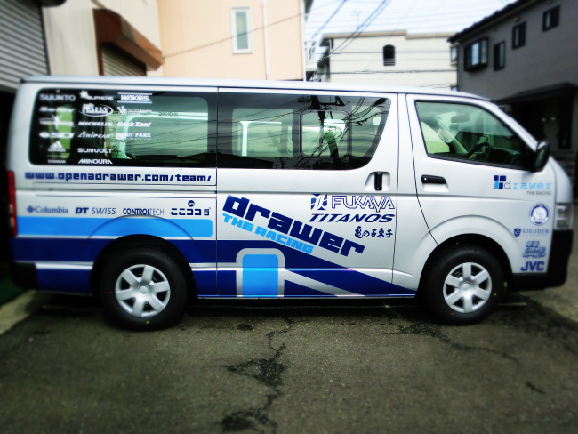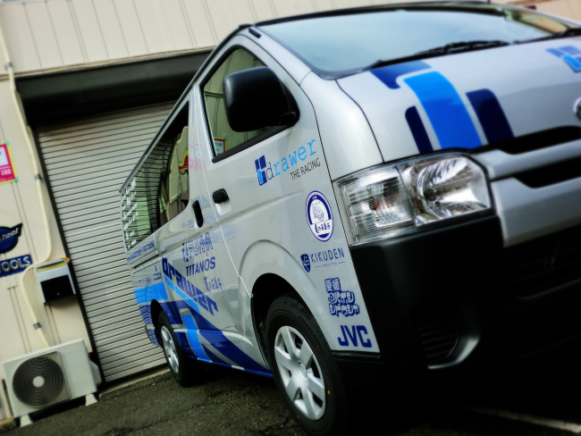 朝まで大雨が降っていたので「drawer」様のサポートカーをラッピング施工できるか不安でしたが奇跡的に9時頃から晴れ間に変わり、無事に完了することができました。