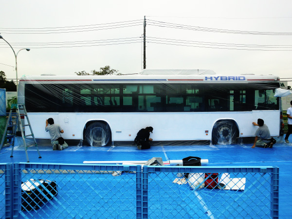 最後に型取りされたラッピングを剥がすと、なんと! イラストが浮き出てくるという仕組み。初めての試みで試行錯誤でしたがラッピング施工を担当していただいたアクスル様の素材選び、バスのデザインを手がけていただいた大塚いちお事務所様のアイデア、傷がつくかもしれない企画にバスを提供いただいた東急バス様、イベント運営に経験を生かしてくれたTOKYO CITY F.C.様、亜細亜大学の学生さん、悪条件の中で撮影をしていただいたWISEのカメラマンさん親子、最後まで諦めずにテストを繰り返したフロンターレの担当者様、そしてイベントを盛り上げてくれたサポーター全員の力で成し遂げられたイベントでした!