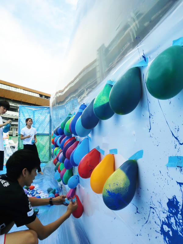 バスに取り付けたインクの入った水風船を、みんなが蹴ったボールでドンドン割っていきバスにインクでペイントをしていきます。
