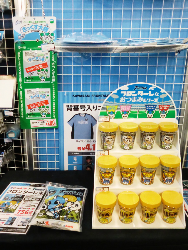 お次は競技場内のオフィシャルショップにある「さっくす大根」用の吊り下げ什器。2016年に製作した「おつまみ」専用什器と並んで
