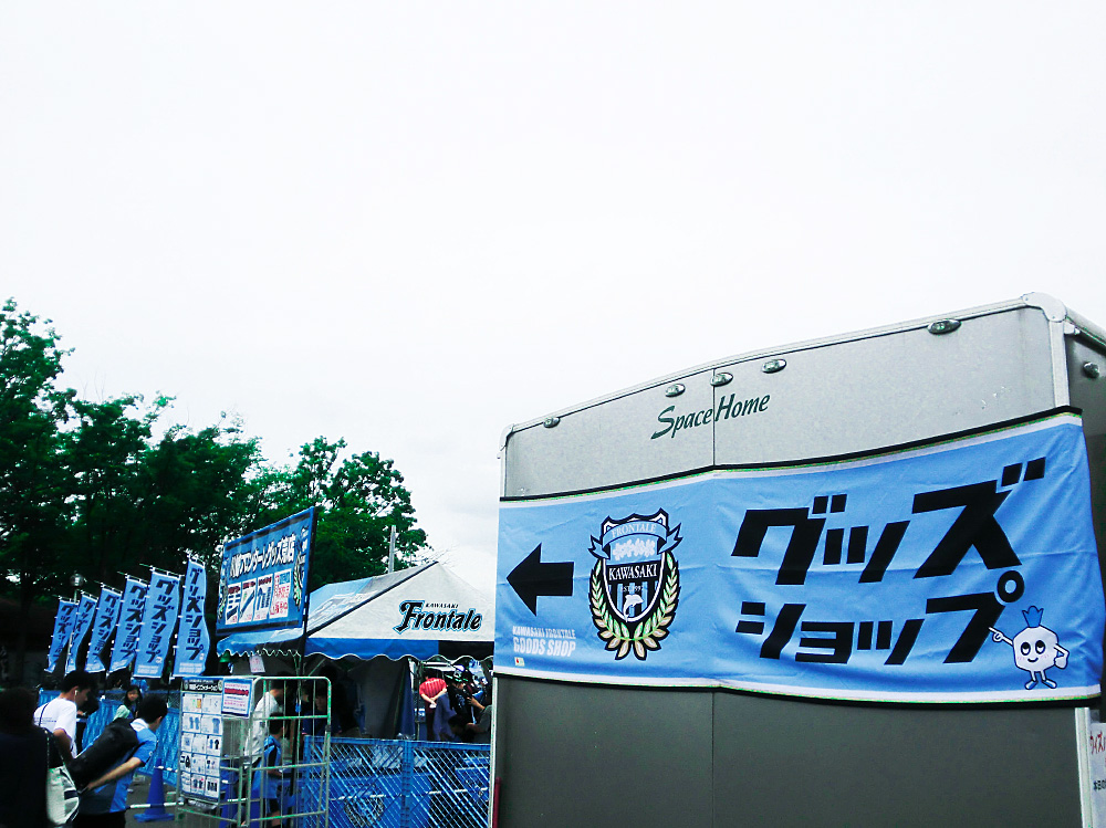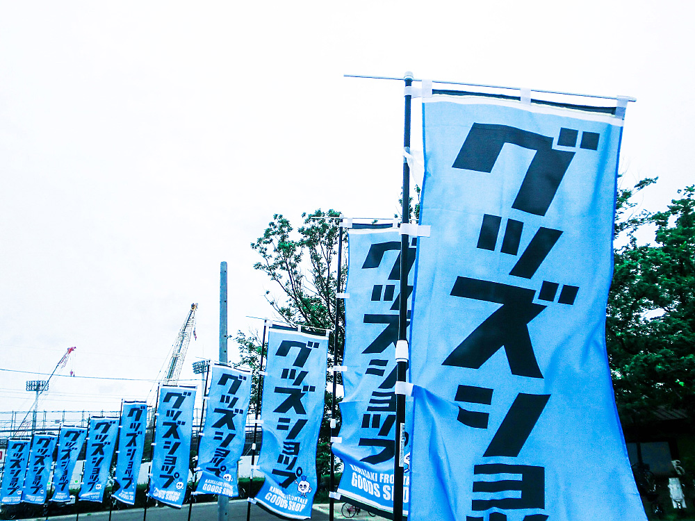 有難いことにグッズブースはノボリ以外にもテーブルクロスやテントサイン、トレーラーに付いているバナー等、トータルでデザインさせてもらっています。少しでも初めて来たサポーターに分かりやすく表示できればと思っています。