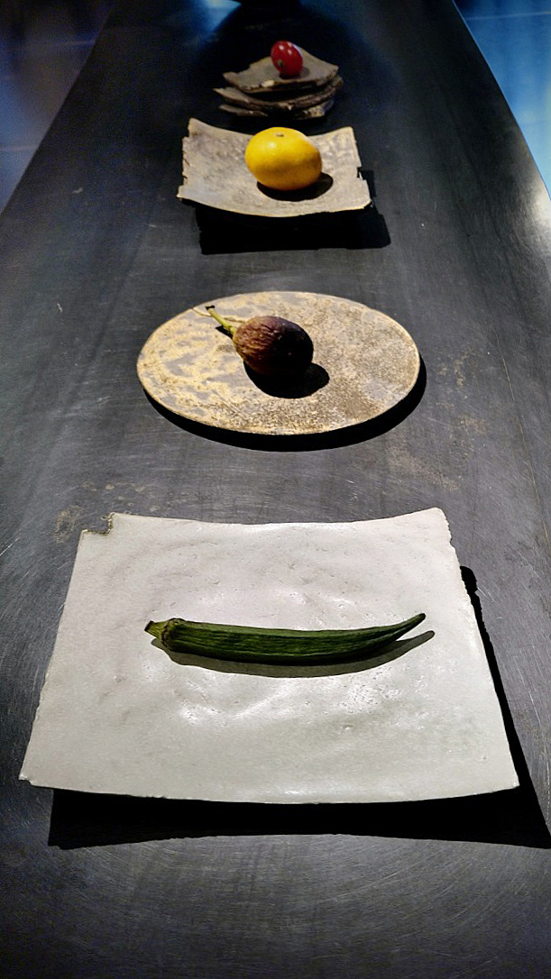 自身の料理に合う器を自ら製作する福田氏の陶器の魅力は素直さではないでしょうか? 陶芸家の作品とは違った立ち位置、あくまで料理が主役としてシェフ目線で製作していることで生まれる自由な発想。
