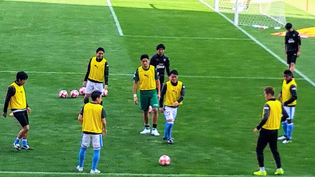 ハーフタイムのグラウンドには中村憲剛選手・小林悠選手・ソンリョン選手と超豪華なリザーブ陣がアップをしているのを見ると選手層では勝てると確信!