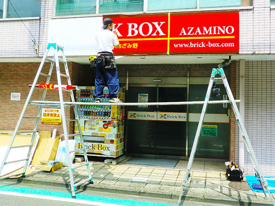古い看板の板面を無理に剥がすとフレームが破損してしまいそうなので、新しい板面を上から固定してシートを貼りましたが、暑すぎてシートもテロテロになってしまい職人さんも悪戦苦闘。何とか3箇所貼り替え終えてイメージも一新できました。