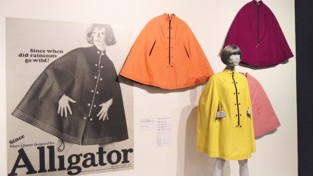 さて「マリー・クワント」と聞くとコスメがメインの女性ブランド・・・程度にしか知識がありませんでした。しかし展示品を見てみると50年以上前にデザインされたとは思えないハイセンスなファッションばかり! 今現在、普通に着ているスタンダードが既にこの時代に確立されていて10年とか20年とか言われる流行りの周期に関係なく、今でも通用するデザインばかりでした。特にレインコートやジャージドレスは可愛くて好みのスタイルでした。一緒に展示されているPOPやグッズ、ノベルティのデザインも古さを感じさせず目を惹きました。